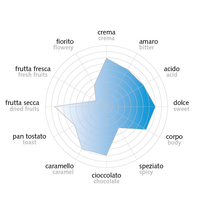 - 100 % Arabica - Torréfaction moyenne - Intensité : Moyenne - Arômes : Cacao, raisins secs, figues et noix - Pour espresso et lungo